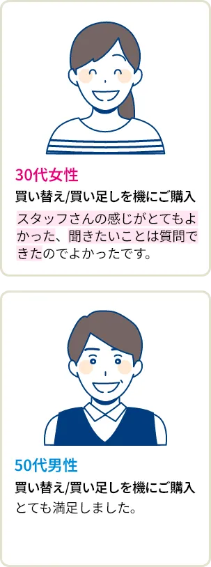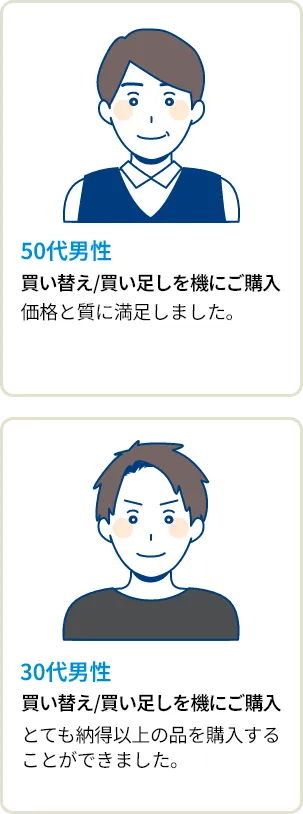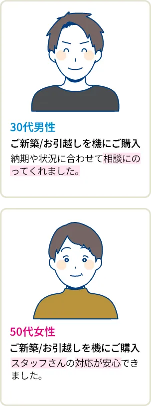 | 不用品のお引き取り | 販売員にお問い合わせください。 お買い換えでご不要になる家具は、 サービス料金でお引取り致します。 ※お引取りの家具は、同等品・同数に限ります。(当社配送地域内) |