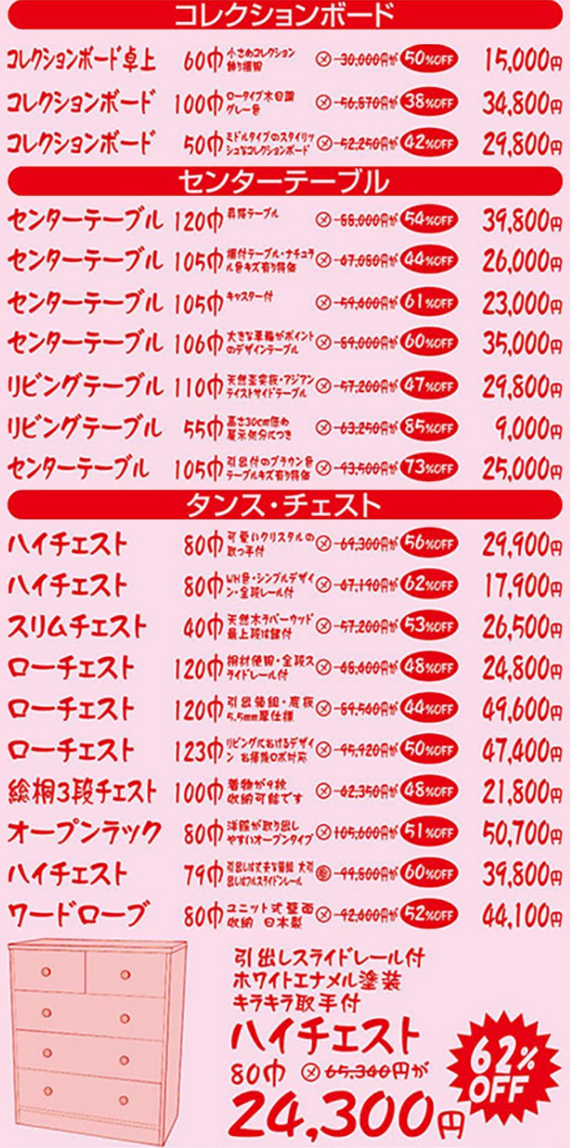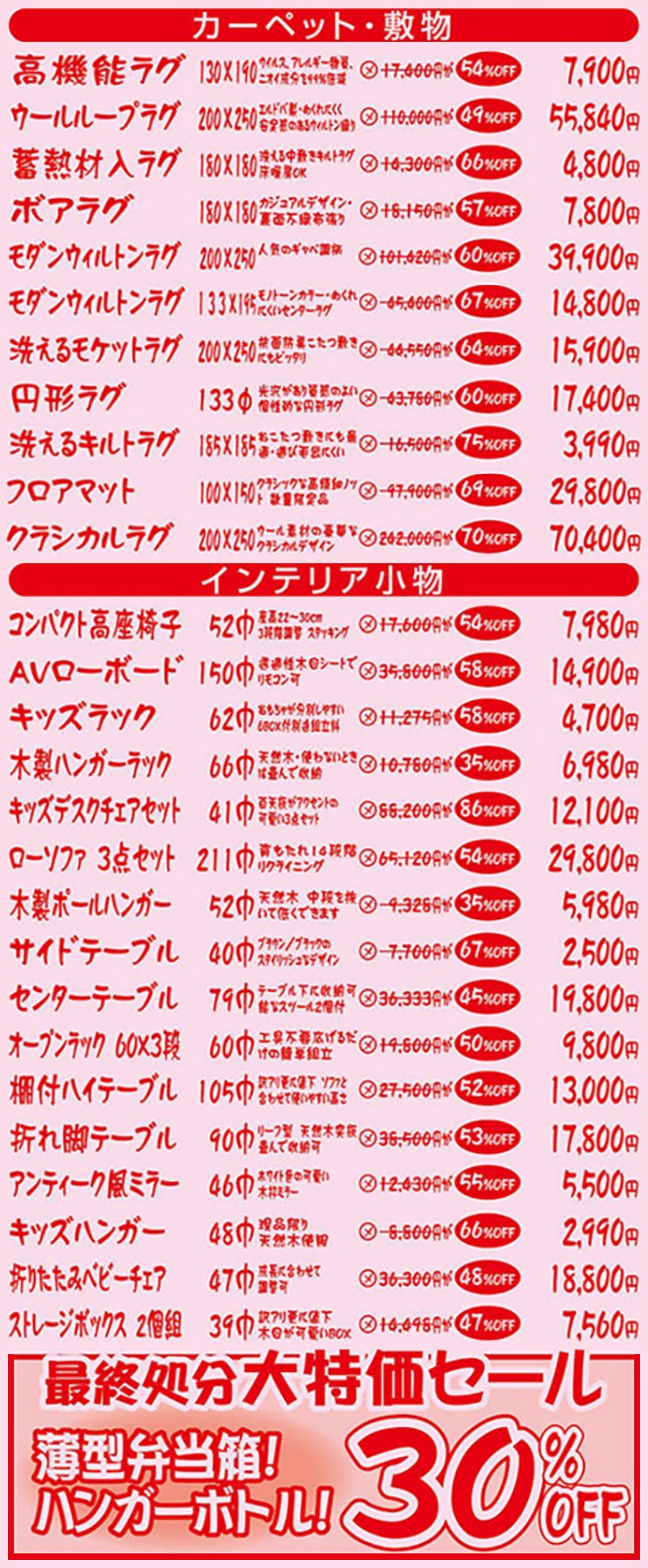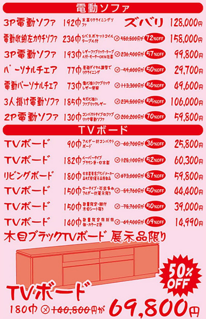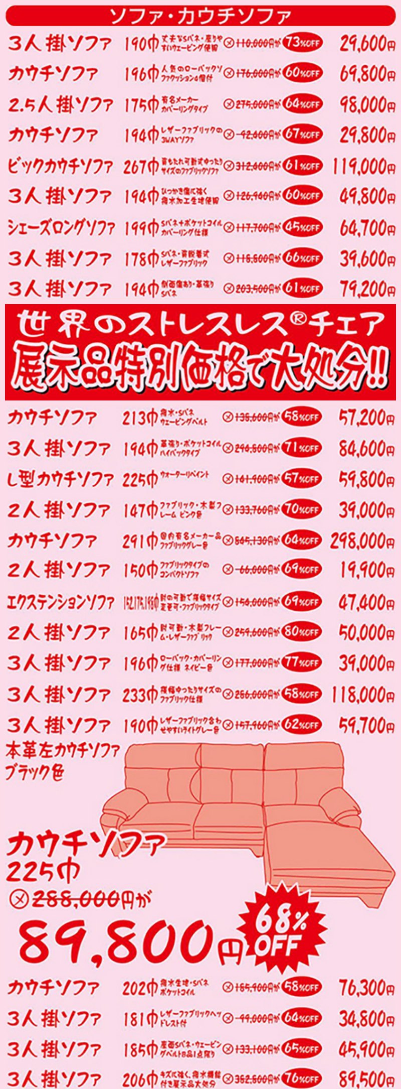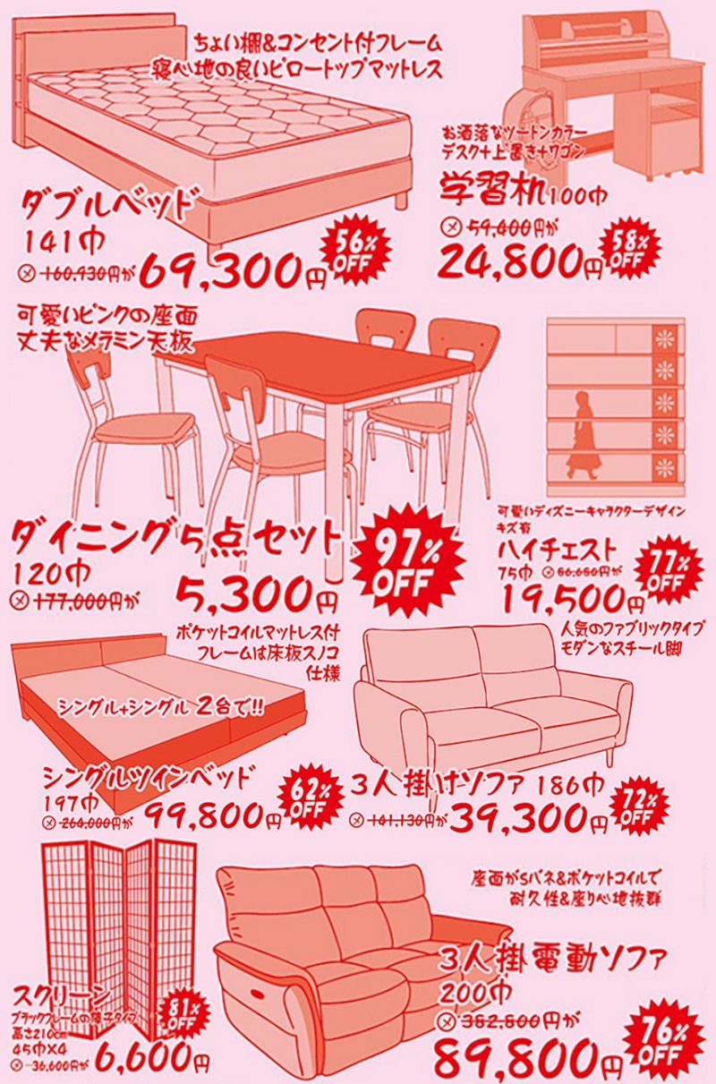 家具のホンダ伊勢崎店が大現品市!最大97%OFF!全館まるごと大処分!